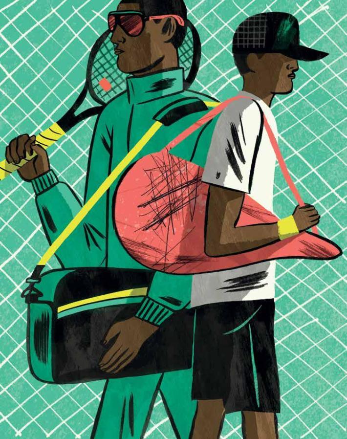 When Archie drove up in his big carpet-cleaning truck, I didn’t want to give up Black George’s racquet. It let you hit as hard as you wanted without even trying. The handle was cushioned with a spongy black overgrip, which Black George replaced dutifully every few weeks. At the base of the head, fastened to the strings, was a round dampener that cushioned your arm from too much vibration when you hit the ball. It was like playing with a very powerful pillow. I replaced it in his bag, next to his towels, bottled waters, and two or three other identical racquets. Archie’s frst love was basketball. We didn’t know what injury had put an end to his career